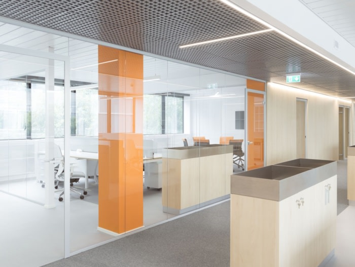 走廊和公共/休闲空间通过不同的地板颜色来区分,以指示特定的区域。天花板的设计也各不相同。照明项目遵循功能层次结构,利用“形状字母表”:工作站的线性照明,休闲区的圆形照明,公共聚会区的悬浮十字结构。相比之下,行政客房的设计更加家庭化,天花板上设有凹形照明。#办公室室内装修风格#