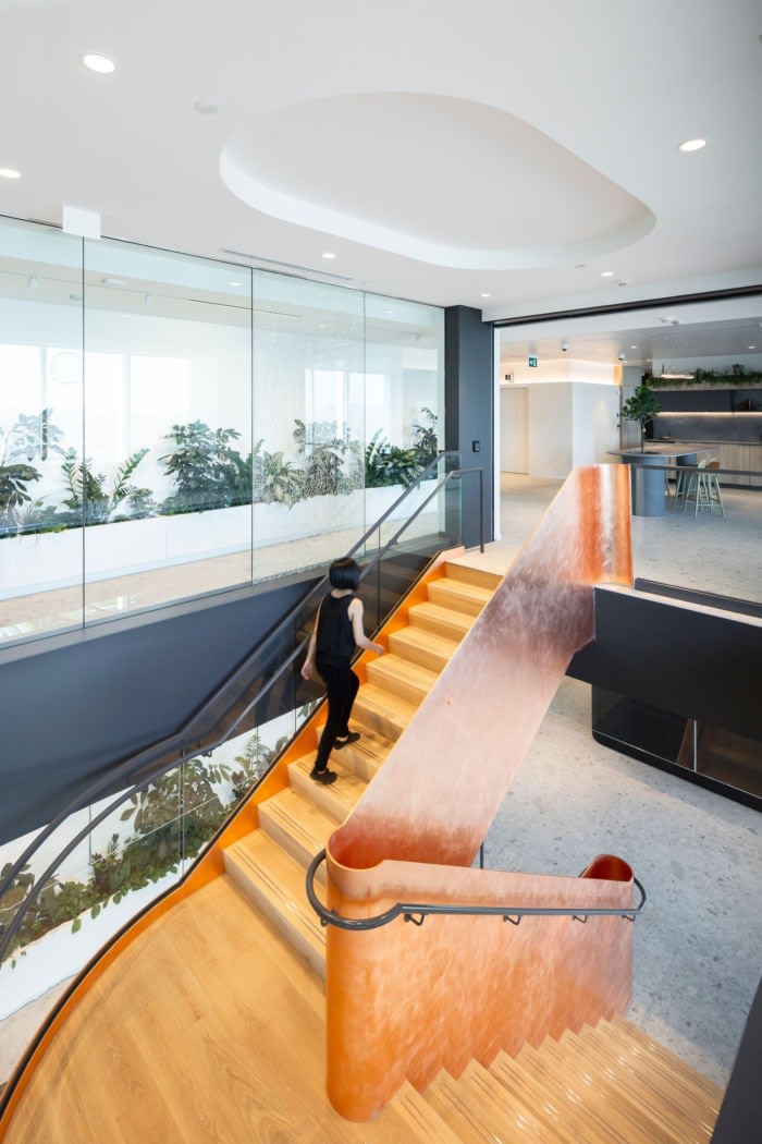 楼梯是一个结构和建筑奇迹,有弯曲的玻璃栏杆、BC 木踏板和铜质装饰??悸堑?33 个航班被吊到一栋有人居住的办公楼中的金属数量,仅物流就是一个奇迹。每层楼都以艺术方式展示的岩石和矿物样本、地质物品和历史悠久的采矿工具为特色。定制的花箱和植物代表了每个会议室的入口,巧妙地刻有元素周期表中的元素,再次加强了与采矿业的联系。#办公楼设计装修公司#