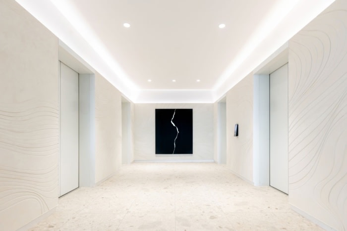 构成空间的非传统材料包括夯土墙和注入沙子的石膏,描绘了世界的地形轮廓。接待区以抽象的手工刮擦石膏墙为特色,而从当地采石场开采的不列颠哥伦比亚省原生木材和花岗岩底座则被用于制作整个空间的所有会议室桌子。#知名办公楼设计装修公司#