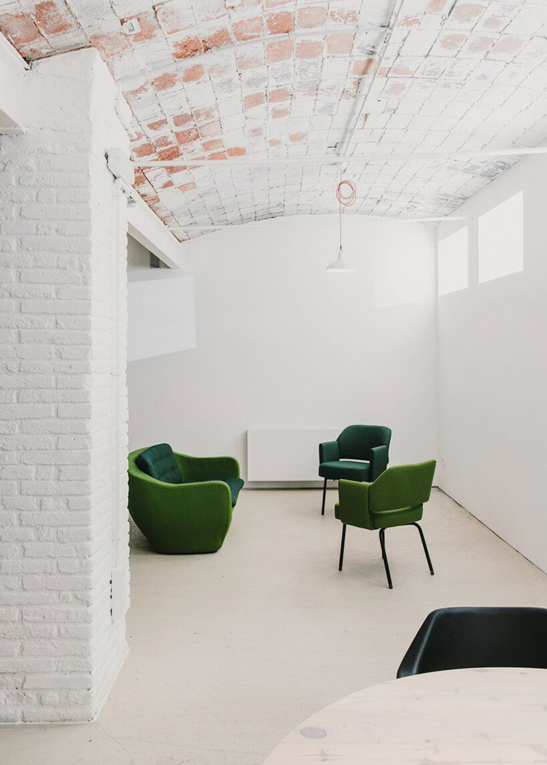 仓库有着绝对的层高优势,所以显得空间特别大,设计师将墙面进行了许多留白的处理,并没有过度的利用这些空间,表现出来最直观的感觉,是一种简单,却丝毫不简单。他们选择保留并利用建筑本身的原始材料,建筑材料表面粗糙的纹理及墙壁上的油漆碎片与当代家具和灯具款式进行搭配,裸露砖拱顶和原始的木材椽结合,办公室里有新的元素融入,也有旧的痕迹留存。