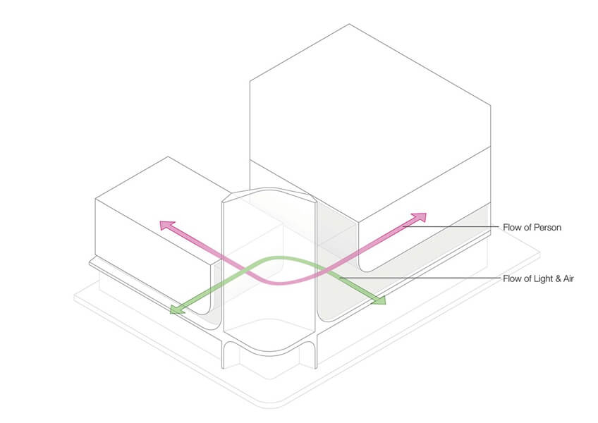 作为一个空间中心,中庭需要一个协调中心。楼梯是作为一个独特的空间装置来发挥作用的。新的舞步从一层到另一层,创造了独特的中庭形象,吸引了更多的人使用中庭,增加了交流的密度。