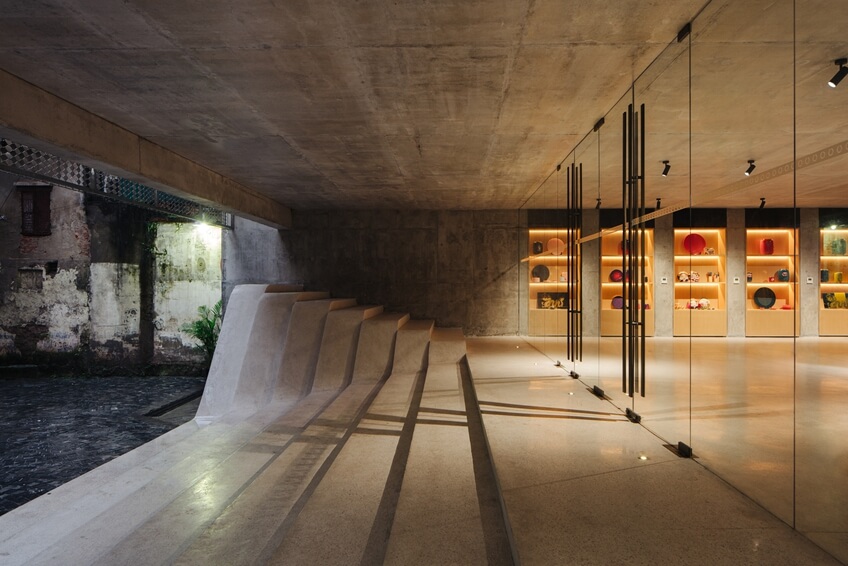 在建筑物的后面,开放的垂直空间允许站点产生自己的光线和通风,从附近混乱中过滤出来的软过滤器。在铜的轻盈色调和精细的抛光细节上,混凝土的粗糙纹理和精细的抛光细节的普遍使用,传达了将粗糙到珍贵,从畜生到抛光的理念。