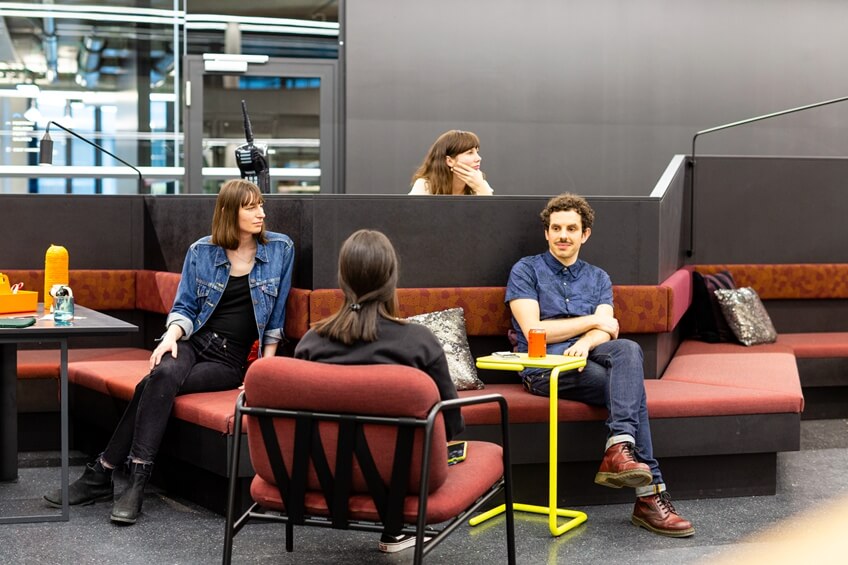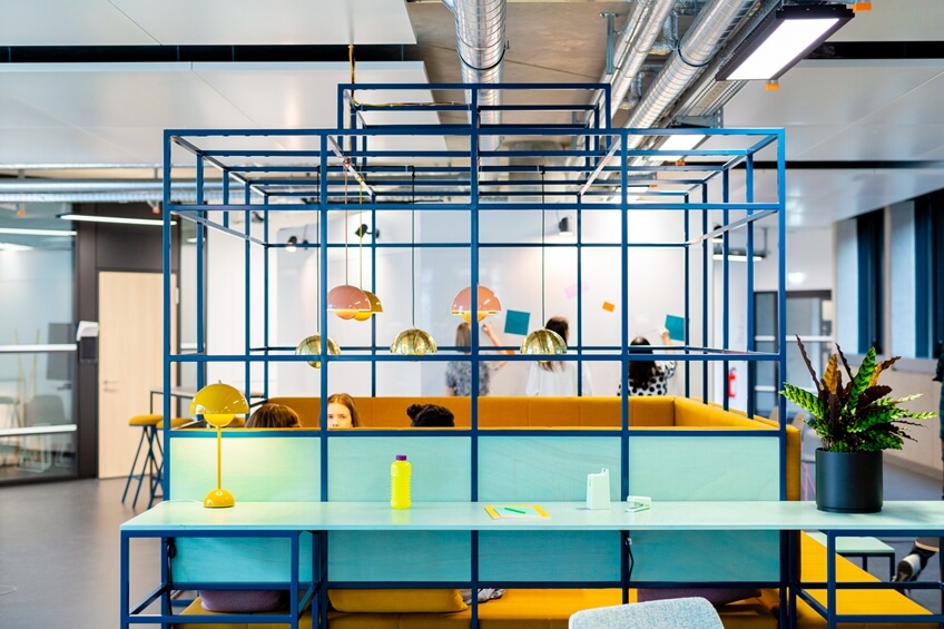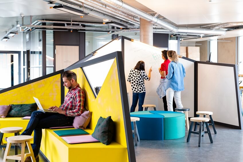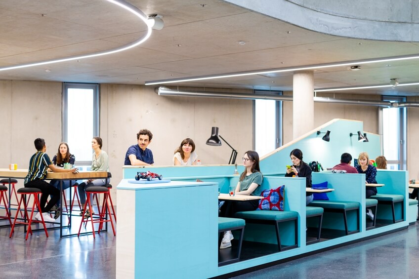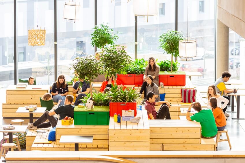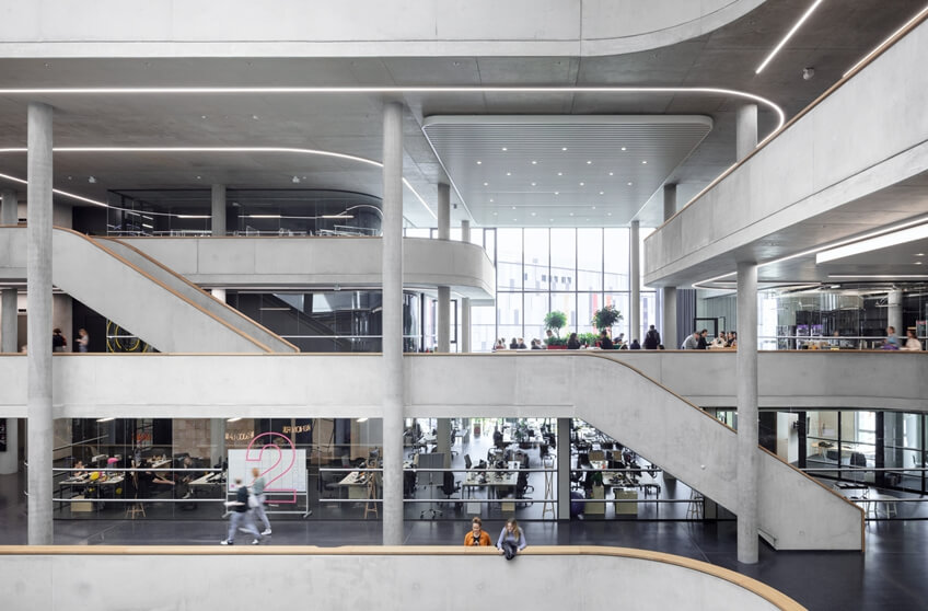 独立的室内布局,通过连锁中庭相两层通高空间来实现,从而营造出一种意想不到的动态空间氛围。再不规律的分散,不仅产生了多层开放空间,还产生更加私密的隐蔽区域,以满足既定的标准,也是工作区域的混合,进而放大这种灵活、交流的氛围。
