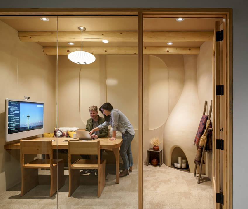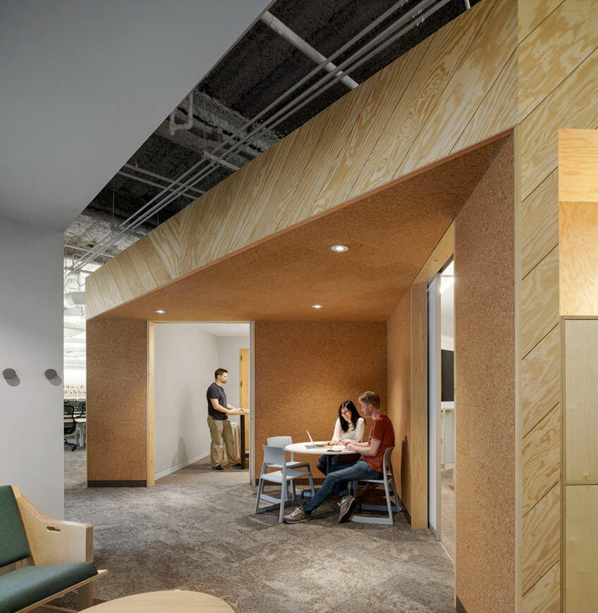 团体活动位于双高度中庭附近,充满了定制的艺术设施,进一步激活这个空间中心,让员工能够看到并参与协同的工作空间。在办公楼层的周边,空间逐渐变得更加私密,以适应整个工作场所的活动。