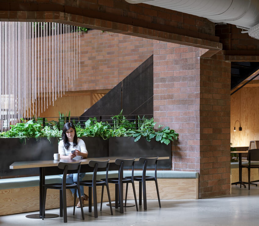 回顾这栋建筑的历史,把过去的两层办公楼装修都剥下来,露出了原来的内部砖层,并重新建立了原来在中庭周围安装的黑色钢制栏杆一样?;谷∠说粝碌奶旎ò?,以提高开放性和灵活性,并创造一个更视觉连接的工作环境。