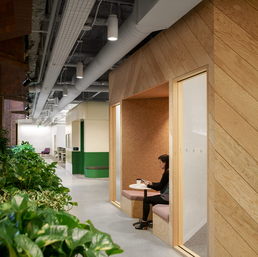 设计采用杉木胶合板和活植物作为主要的设计材料,整个办公室,软化硬边,并带来一些户外内部景色。为了创造惊喜和奇迹,把绿色植物放在意想不到的地方,包括屋顶,柜子,甚至桌子里。